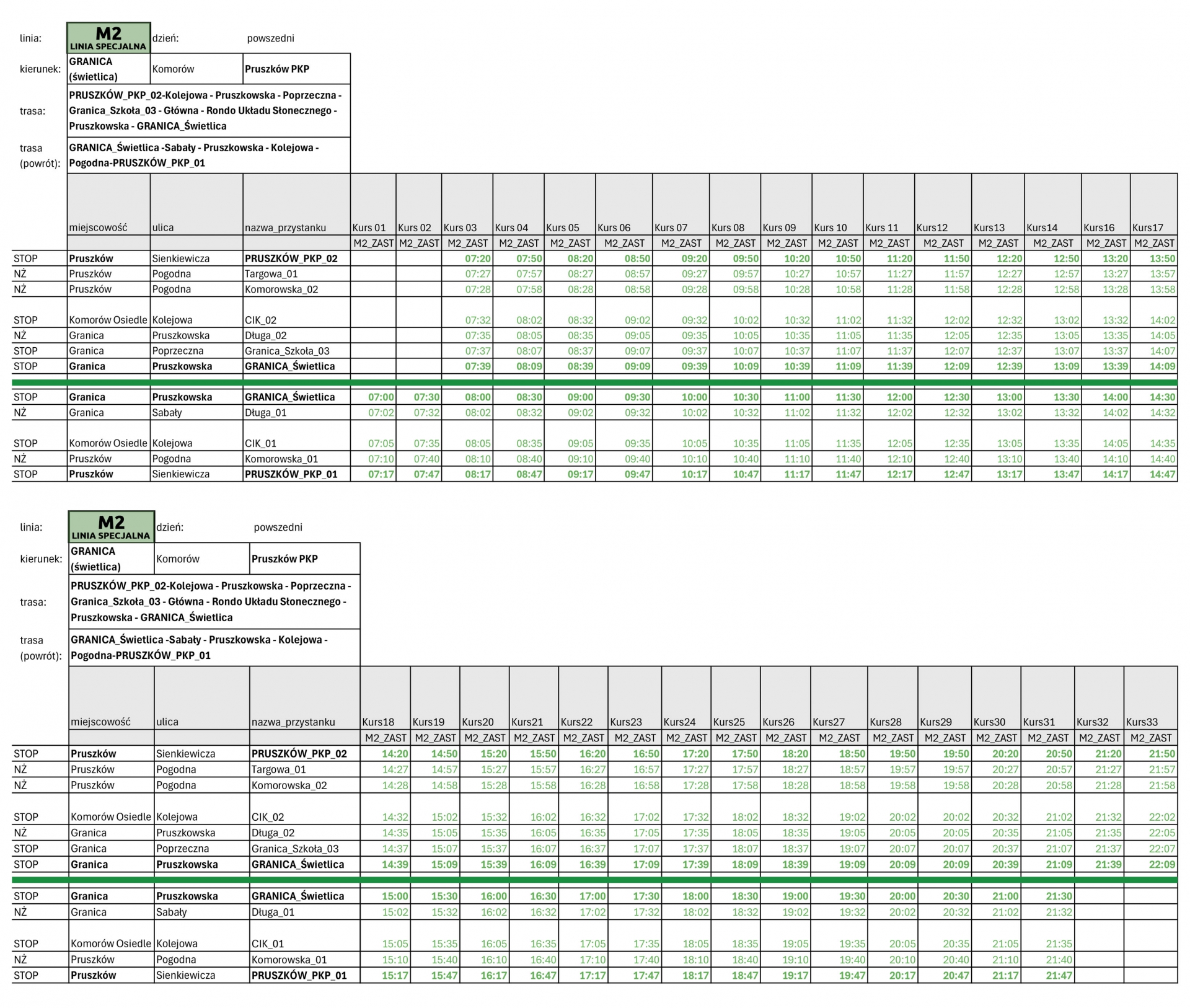 Trasa powrotna: PKP Pruszków → Targowa → Komorowska (Pogodna) → CIK Komorow (ul. Kolejowa) → Granica ul. Długa (Pruszkowska) → Granica Szkoła (Poprzeczna) → Granica (Świetlica)