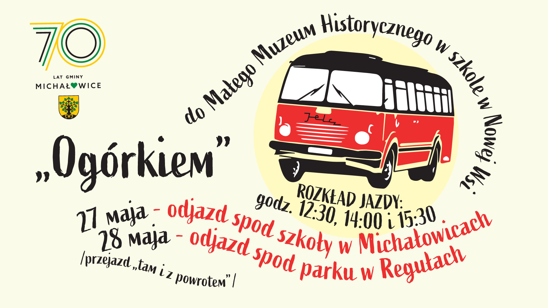 Dodatkowo zapraszamy mieszkańców na wycieczkę "Ogórkiem" do Małego Muzeum Historycznego w Nowej Wsi. Spod szkoły w Michałowicach w godzinach: 12:30, 14:00 i 15:30 odjeżdżać będzie autobus, który przewiezie mieszkańców (tam i z powrotem).