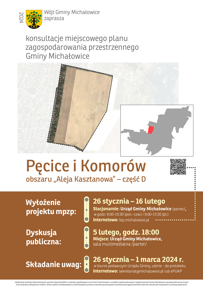 - WYŁOŻENIE PROJKETU - z projektem MPZP wraz z prognozą oddziaływania na środowisko można zapoznać się w okresie od 26 stycznia do 16 lutego 2024 r. w Urzędzie Gminy Michałowice w Regułach przy ul. Aleja Powstańców Warszawy 1, w Biurze Podawczym Urzędu Gminy na parterze (z wyjątkiem sobót, niedziel i świąt), w godzinach od poniedziałku do czwartku 9.00-15.30, w piątki w godzinach 9.00-13.30 oraz na stronie internetowej gminy Michałowice - link